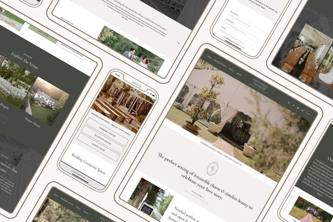 For this project, we refreshed their old website on Squarespace 7.1 with a 1-week custom website package (yep - site in just 5 days!!). Our goal with this website was to focus the design on creating a high-end, authentic customer journey clearly displaying their beautiful property and all of the spaces and making it as easy as possible for clients to inquire. We used their gorgeous client photos and timeless fonts, optimized flow, and curated color palettes to achieve an inviting & informative site design!